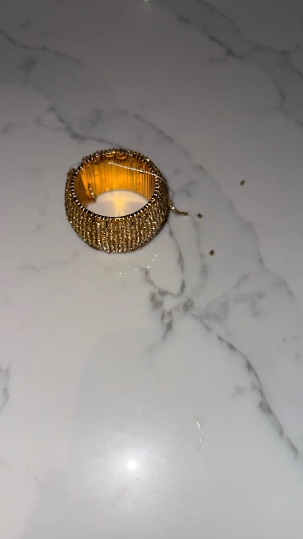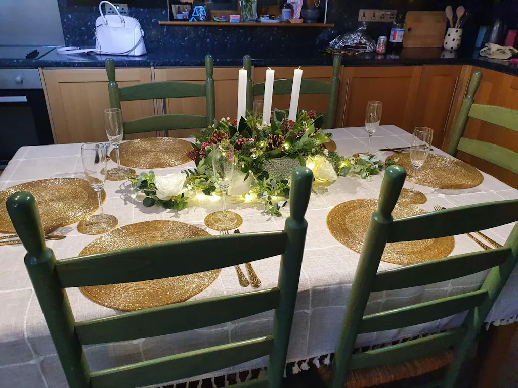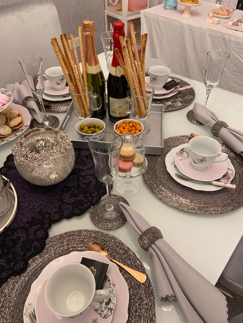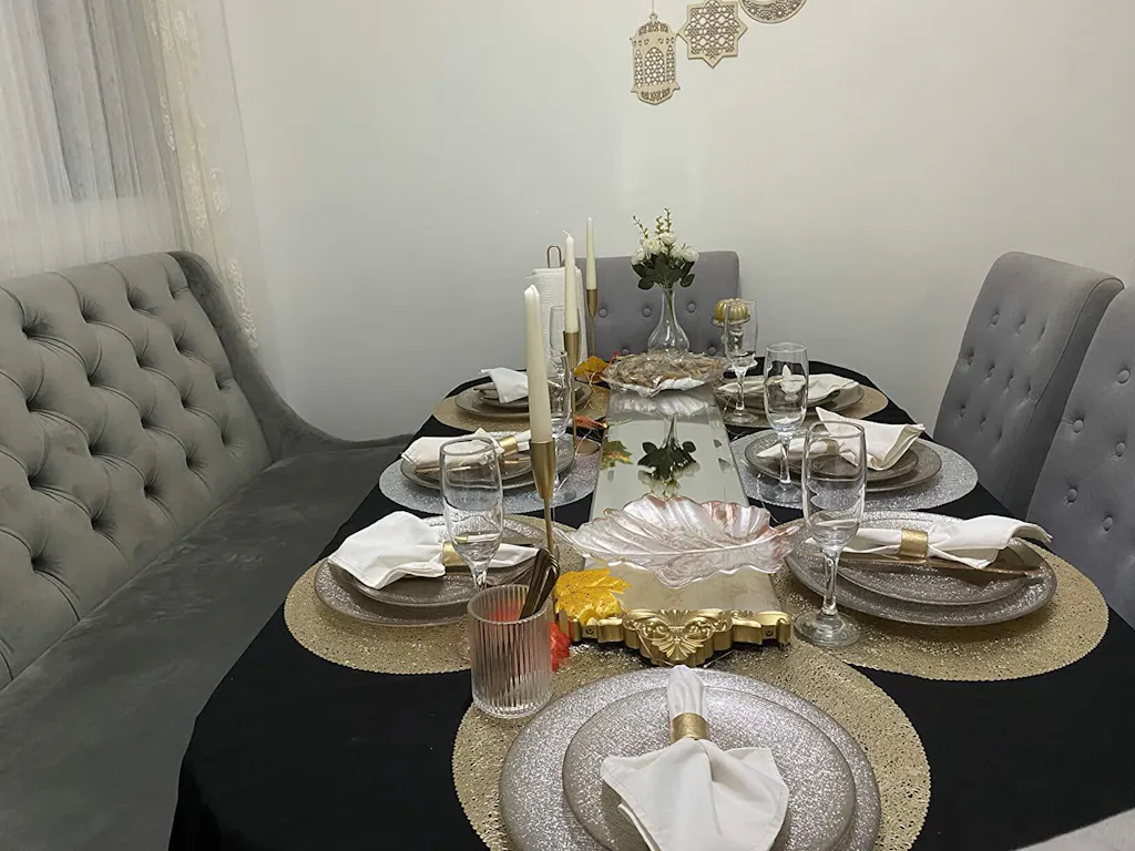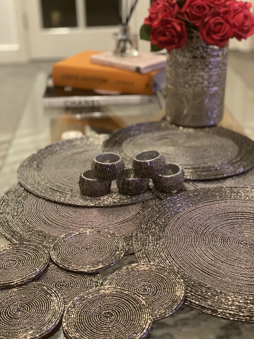 Maße: Tischset mit 32 cm Durchmesser, Untersetzer mit 10 cm Durchmesser, Serviettenring mit 5 cm Durchmesser